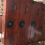 Furniture & Lighting: Quality furniture (all in pristine condition) include multiple tansu small and large, 2 early Chinese red chests with gilded wood carved doors, 2 early lawyers bookcases, marble topped Bavarian ormolu rams head round table, cherry wood early intricate Bavarian desk & 4 high end modern orange leather chairs by KFF. Other great pieces include an amazing tall red & black lacquered high organizer with many drawers, multiple desks including an early oak roll top, mid century bar, very interesting Japanese high wardrobe, multiple early caned chairs & a small English wardrobe. Lighting include a terrific pair of mother of pearl inlaid column lamps, antique & modern desk lamps, a very pretty reverse painted early library table lamp & modern lamps including pretty tall modern lamp by Koncept.