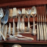 Jewelry & Collectibles: Whole table with sterling flatware (2 sets) and hollowware, very good ethnic jewelry and sterling. Collectible china sets, Chinese lamps and early dishware, Belleek, Japanese vintage trinkets, glassware, entire room with collectible pieces.